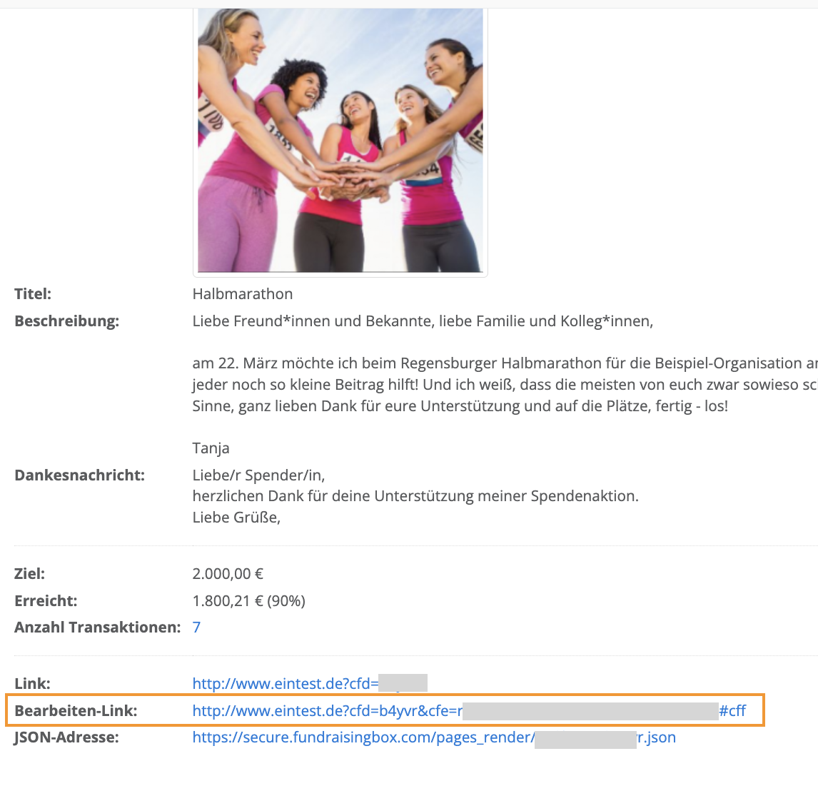 neben einer Aktion, um weitere Informationen zur Aktion anschauen zu können. - Wenn Sie auf den Namen der Aktion klicken, sehen Sie eine detaillierte Übersicht der Aktion: Hier finden Sie u.a. auch den geheimen Bearbeitungs-Link, der bei Verlust dem Spendensammler erneut zugesendet werden kann.