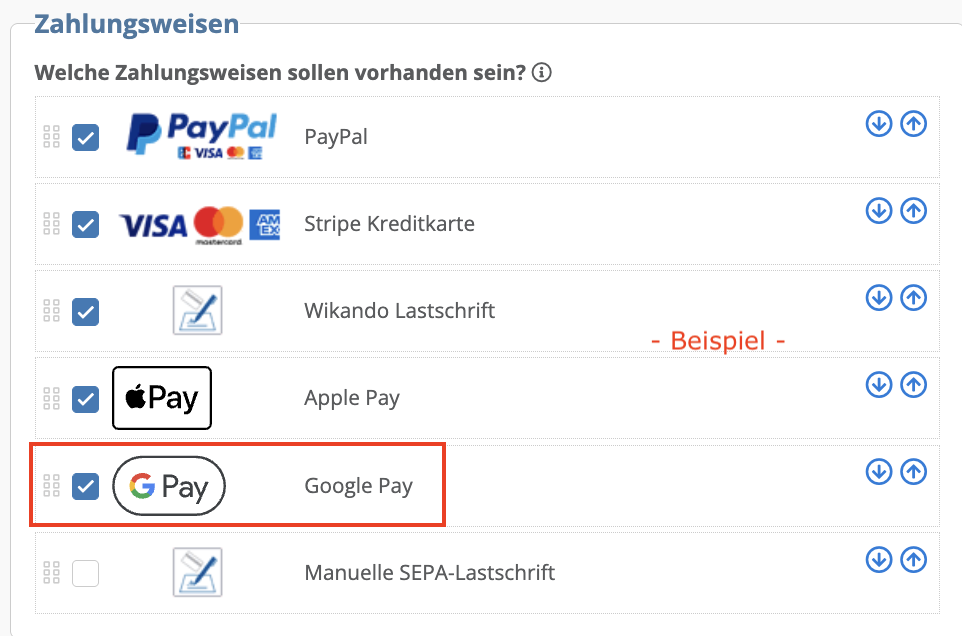 und wählen aktivieren aus.Hinweis: Stripe Kreditkarte muss als Zahlungsweise vorab aktiviert sein, um Google Pay aktivieren zu können.