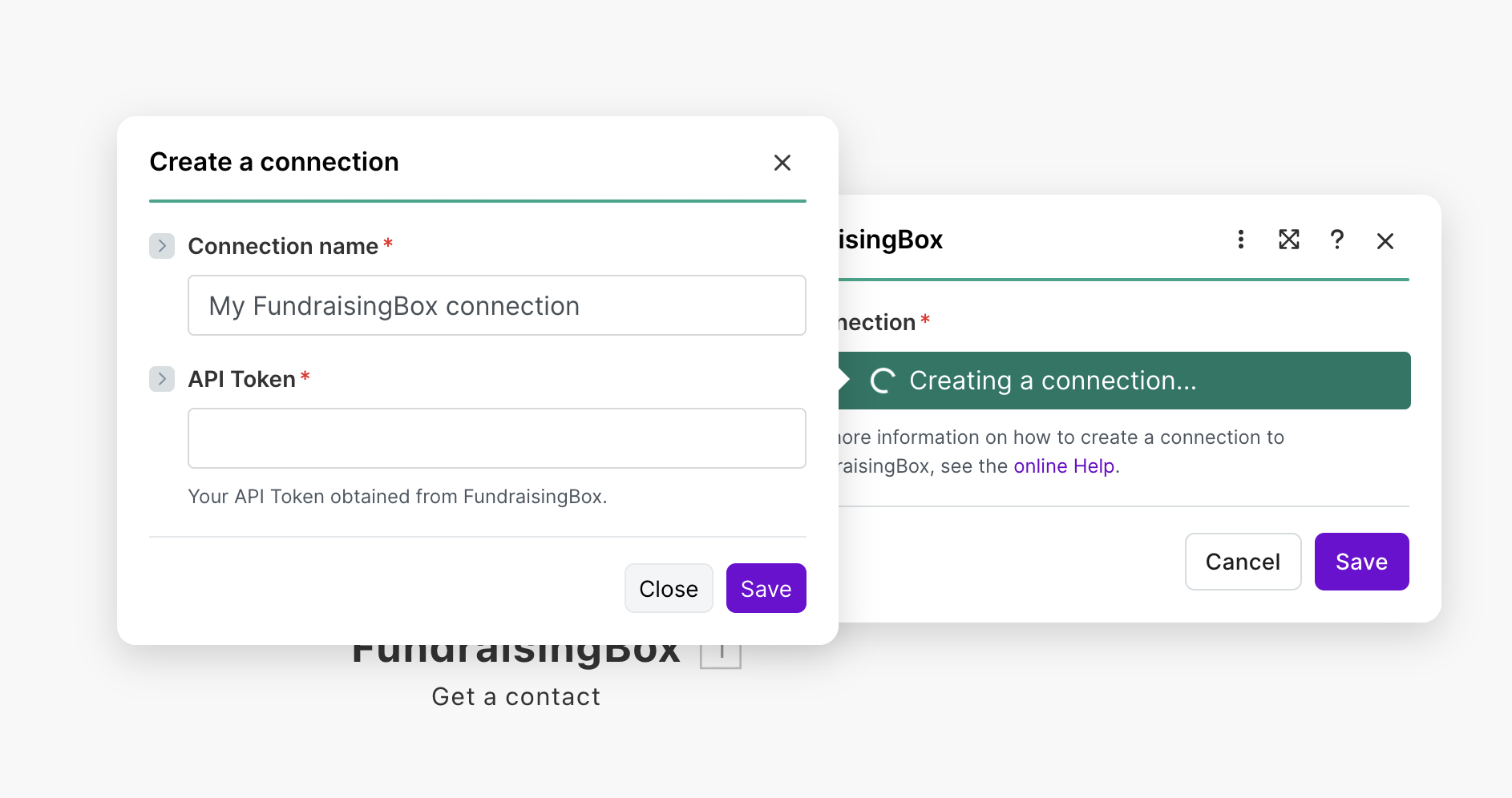 - Stellen Sie eine Verbindung zur FundraisingBox her und fügen einmalig den REST API Token des FundraisingBox Logins ein