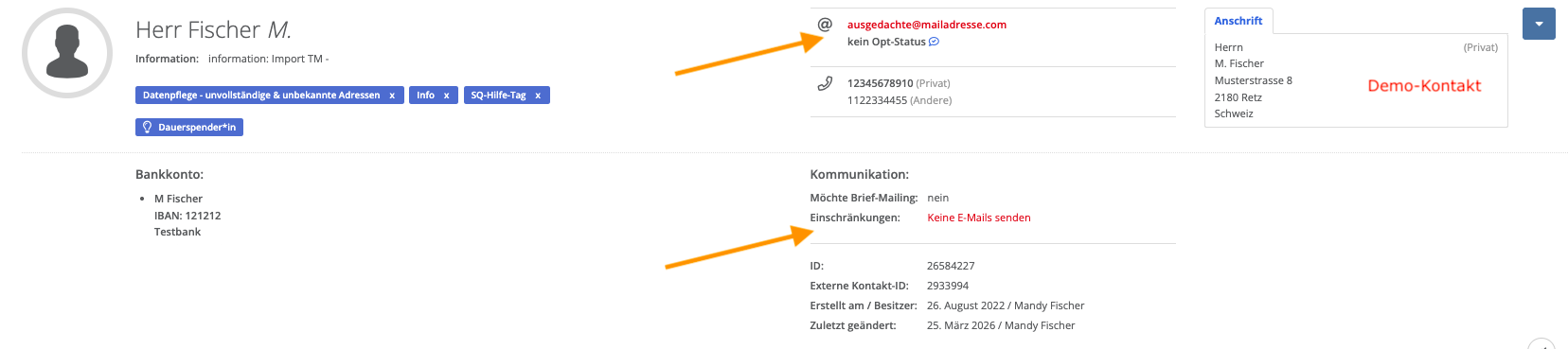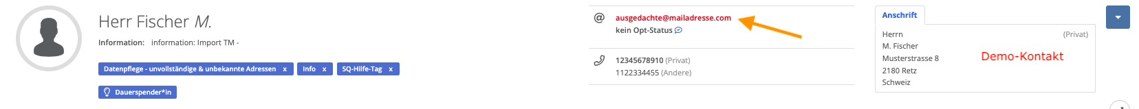 - wird die E-Mail-Adresse des Kontakts rot markiert, sodass Sie sofort erkennen, dass keine E-Mails gewünscht sind